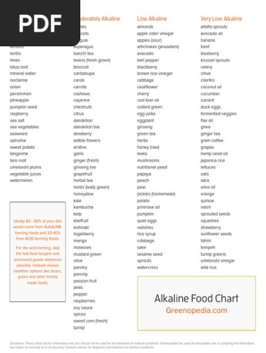 For optimum health it is recommended that your diet consists of the following proportions although any shifts in diet towards more alkaline foods are good no matter how small. Alkaline foods chart here is a new comprehensive list that i compiled for my book to create a more thorough and accurate alkaline foods list to help you identify the degree of alkalinity and acidity. Alkaline diet system if you are anxious to get started. 70 alkaline foods 20 neutralmoderately acidic foods 10 acidic foods naughty indulgences downloading the alkaline food list pdf.