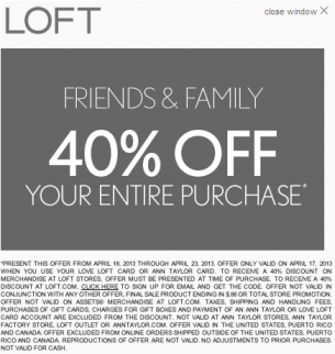 Ann taylor loft coupons in store printable. Primarily marketed under the ann taylor and loft brands the goal of the retail store is to instill confidence in women. If youre shopping in store look for price tags ending in. Loft is a us retail chain specializing in womens clothing shoes and accessories. Loft along with ann taylor and lou grey is a subset of ann inc.