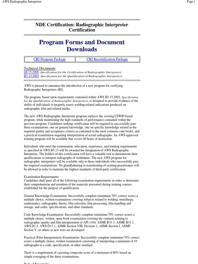The five day aws certified radiographic interpreter cri seminar is designed to ensure that individuals have the knowledge to properly assess indications produced on radiographic media of weldments or adjacent base metal. Please visit the documents tab to access the cri 9 year recertification application. It will prepare you for the cri certification exam which is given at the end of each seminar week. At any time during your nine year cycle if you meet the prerequisites you can apply to become certified as an aws certified radiographic interpreter cri.