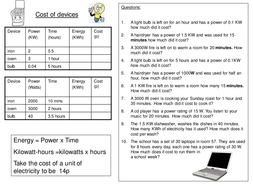 Calculating Electrical Energy And Cost Worksheet Answers
