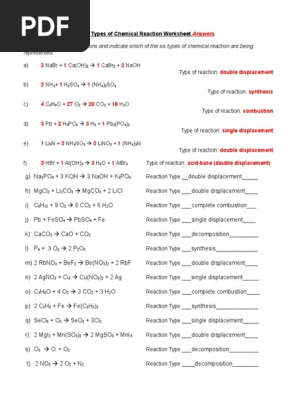 Types Of Chemical Reaction Worksheet Practice Answers