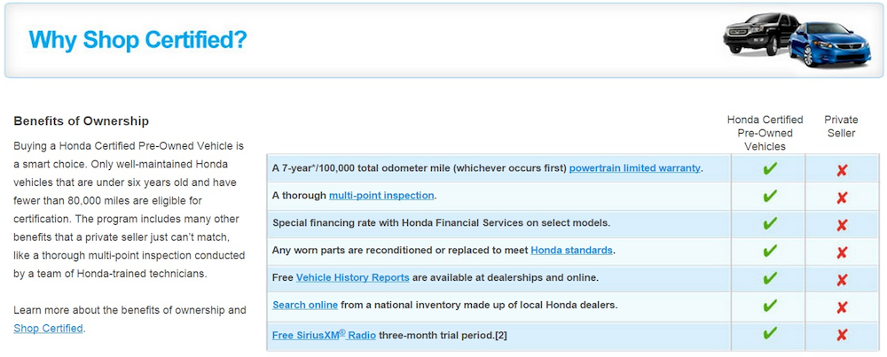 With an extended vehicle protection plan from carchex you can save yourselfand your walletfrom high bills from the auto shop. 1 the honda certified pre owned vehicle limited warranty extends the powertrain coverage to seven years from the original in service date or 100000 total odometer miles whichever occurs first. It covers major engine and transmission components except for standard maintenance items body glass and interior. Thanks to an extensive used car warranty every honda certified pre owned vehicle comes with peace of mind.