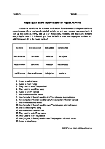 Magic Square On Spanish Imperfect Tense Conjugation Of Regular Ar Verbs Fun Worksheet No Prep