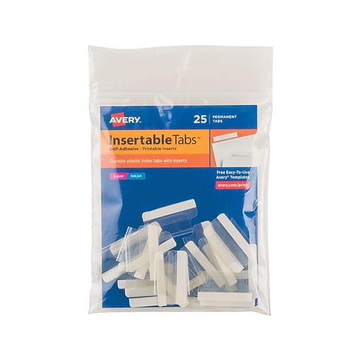 Shop for index tabs inserts in binders accessories. Avery 16241 index tabs with printable inserts 2 inch wide clear tabs 25pack. The self adhesive tabs stick. The printable inserts work with laser or inkjet printers for convenient customization options while the permanent self adhesive tab backings affix securely to the edges of file folders.