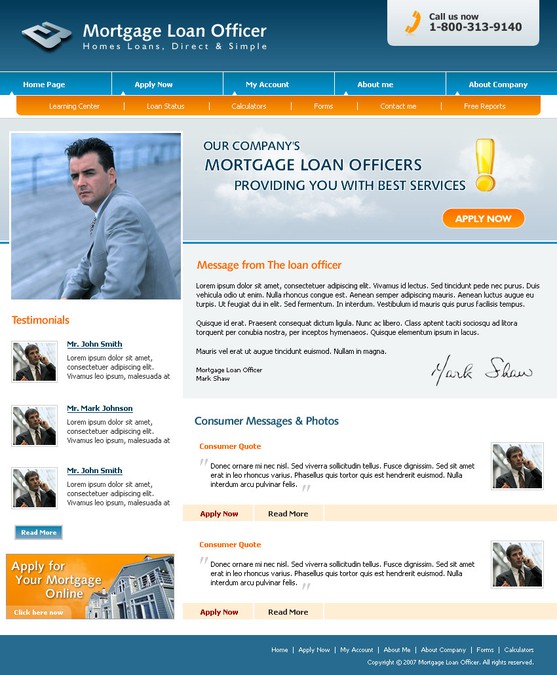 We offer mortgage websites that fit every clients needs. Any of our mortgage website designs can be converted into a loan officer website. Therefore the only difference between our company and loan officer package is a price break. We strive to create cost effective and easy to use mortgage websites.
