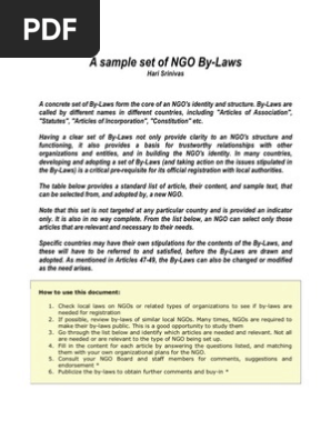 Sample bye laws of society ngo. Nonprofit bylaws are the rules and procedures that your organization follows to ensure legality and productivity. Many times ngos are required to make their bye laws public. Your bylaws will serve as your organizational manual and will help guide you through the orderly operation of your corporation.