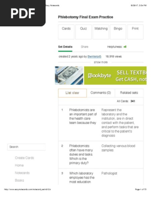Learn vocabulary terms and more with flashcards games and other study tools. Venipuncture quizlet phlebotomy training locator venipuncture quizlet find the phlebotomy training you need to advance your career opportunities. Aspt phlebotomy certification flashcards by quizlet phlebotomy exam study guide by quizlet it is important to check with your home state to see what licenses or certifications they require a phlebotomist to hold as each state has different requirements. Choose from 102 different sets of phlebotomy training flashcards on quizlet.