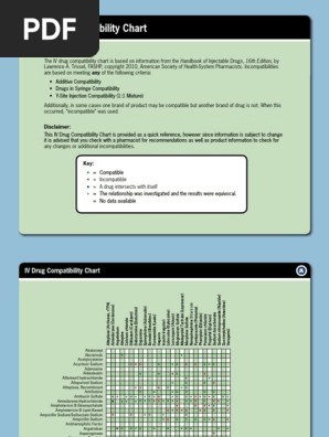 Printable iv compatibility chart 2018. Check tubing below y site. Microsoft word app y site compatibility critical care chart updated oct 31 2018 author. The king guide wall charts are a useful reference to have visible in the hospital and pharmacy for situations where a quick yes or no answer is needed. A d5w ns lr abatacept b aldesleukin a alemtuzumab c arsenic trioxide asparaginase atropine sulfate azacitidine bendamustine bevacizumab bleomycin bortezomib busulfan.