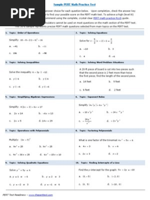 Printable pert math practice test. These practice question are designed to be similar to those found on the math section of floridas postsecondary education readiness test. Pert computerized placement test review booklet for mathematics valencia college orlando florida prepared by valencia college math department. Topics covered include equations exponents percents prime numbers polynomials order of operations and algebraic expressions. More specifically you will be expected to compose some sort of life goal.