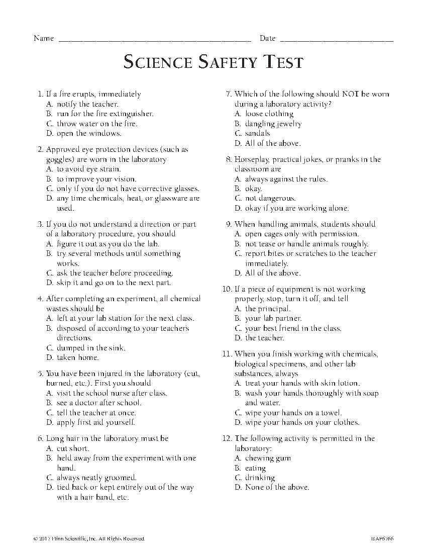 Safety In The Science Classroom Worksheet
