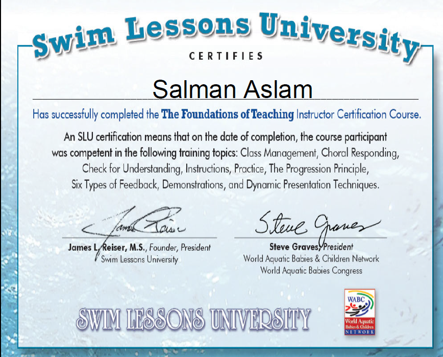 Swim lesson certification. Our swimming instructor training and certification system is comprehensive easy to access and apply and includes the supporting tools such as lesson plans and a water safety focused awards system to make your learn to swim program a success. To find indoor pools near you please visit our pools page. Through our aquatic instructor training program you can help recreational swimmers meet their goals. Find a class thats right for you.