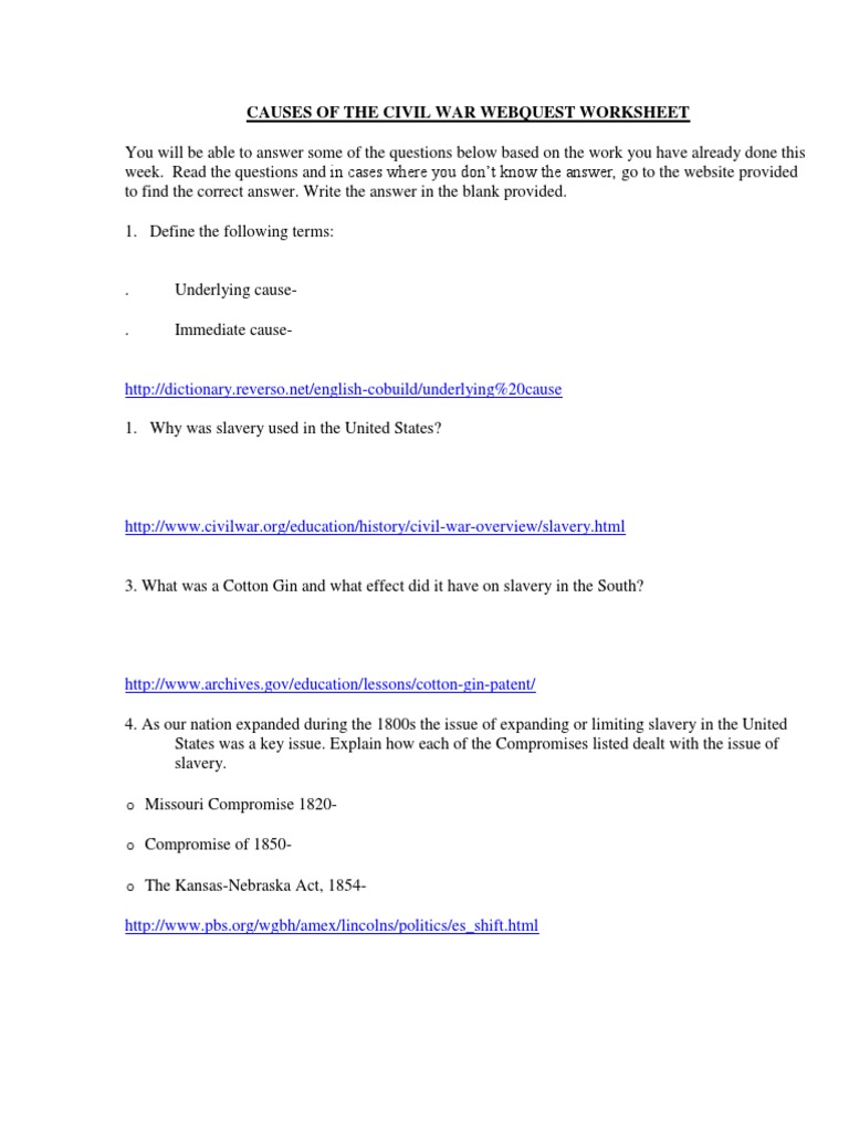 Causes Of The Civil War Webquest Worksheet American Civil