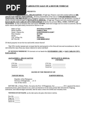 Deed Of Absolute Sale Of A Motor Vehicle Doc