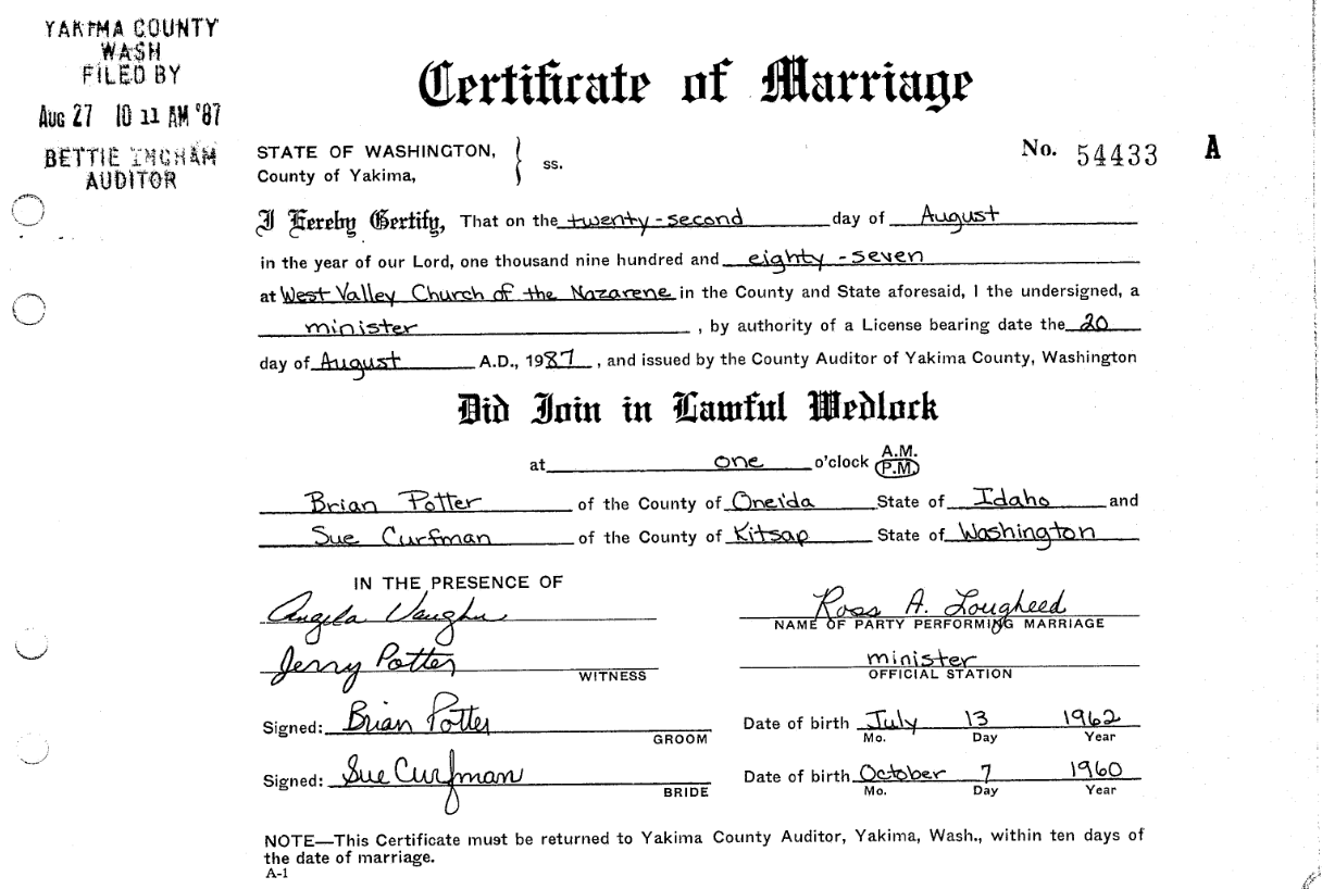 Potter Profiles Potter Curfman Marriage 1987 Yakima Wa